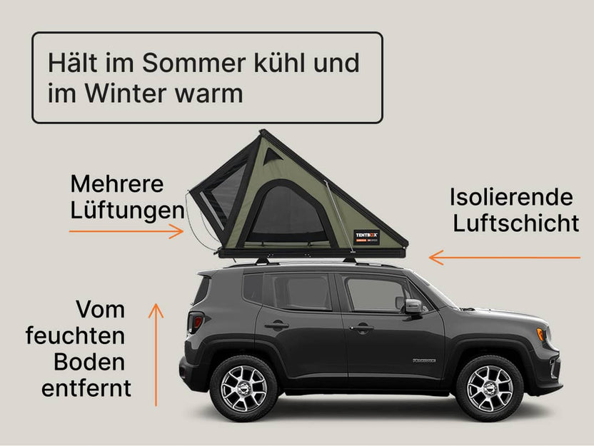 Was die Wärme angeht: Ein Dachzelt von TentBox ist von Natur aus isoliert, da es vom Boden abgehoben ist und eine Luftschicht als natürliche Isolierung bietet. Die Schaumstoffmatratze sorgt für zusätzlichen Schutz, und mit einem warmen Schlafsack bist du auch bei kälteren Temperaturen bestens ausgerüstet. Viele TentBoxer sind sogar bis zum Polarkreis gereist – mit durchweg positivem