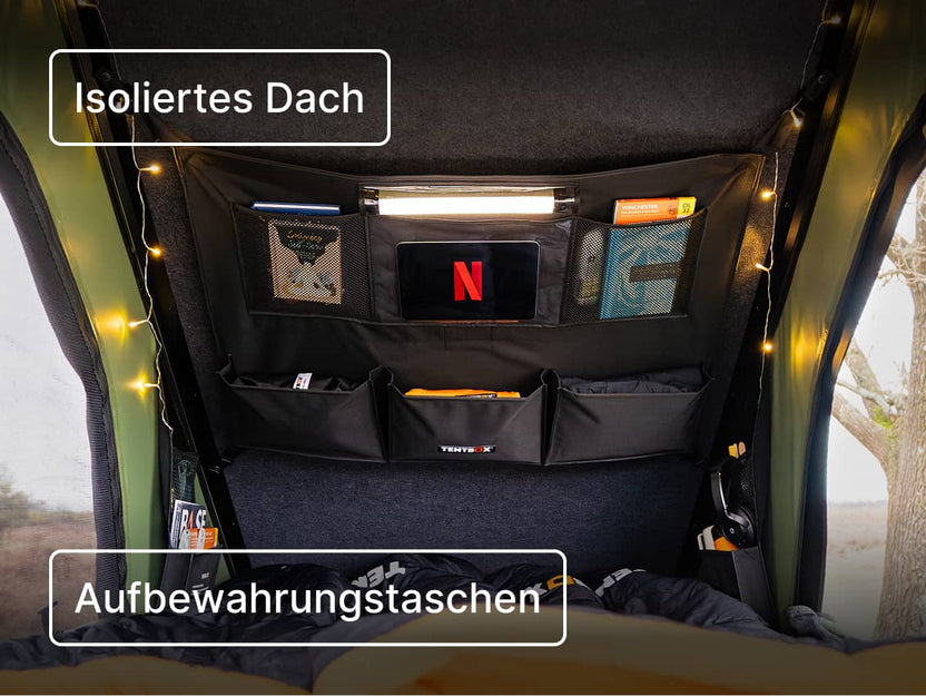 Der Aufbau geht super schnell, und eine Matratze ist bereits dabei. Je nach Modell kannst du dein Bettzeug sogar im Inneren lassen, damit alles schon bereit ist, wenn du die TentBox aufklappst. Weil du vom Boden abgehoben schläfst, hast du eine tolle Aussicht, bleibst trocken und bist weit weg von Kälte, Matsch und Krabbeltieren. Zwischen dem Autodach und der TentBox entsteht außerdem eine natürliche Luftschicht, die isoliert und dich angenehm warm hält.