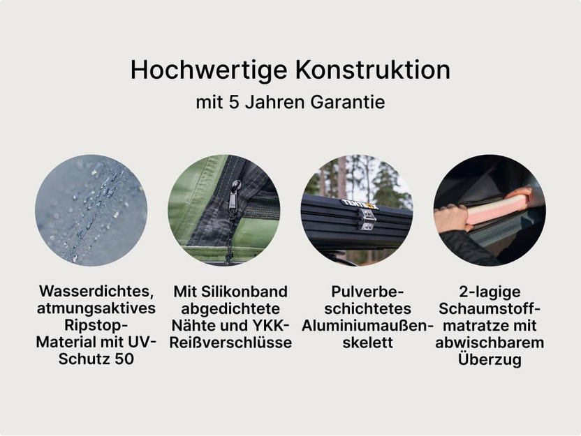 Alle unsere TentBox-Dachzelte sind so gebaut, dass sie auch starkem Wind und schlechtem Wetter problemlos standhalten. Selbst bei Sturm bleibst du trocken und sicher – dank des robusten Stoffes und der hochwertigen Konstruktion.