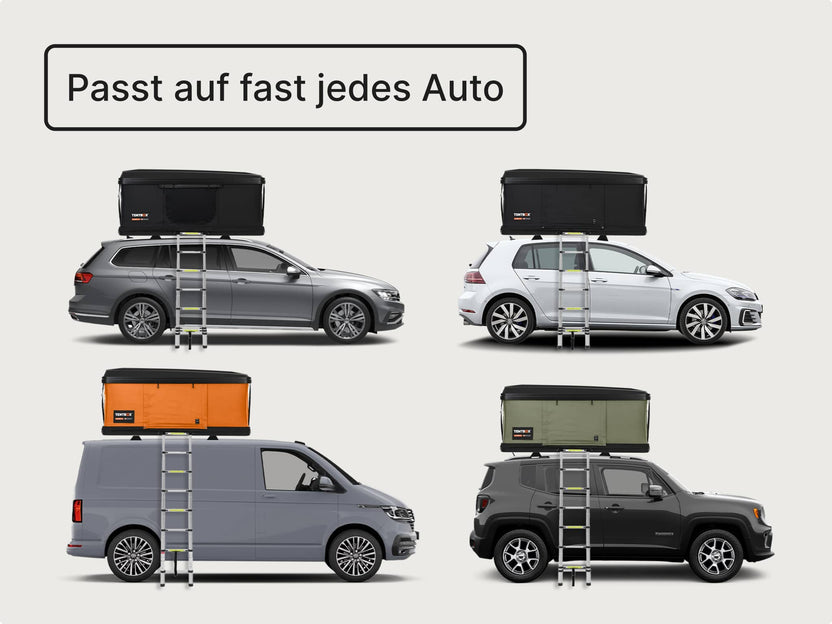 Kompatibilität: Die meisten Fahrzeuge passen zu mindestens einem TentBox-Modell. Unsere Kurzanleitung hilft dir beim Einstieg, oder du kontaktierst uns direkt für eine persönliche Beratung..