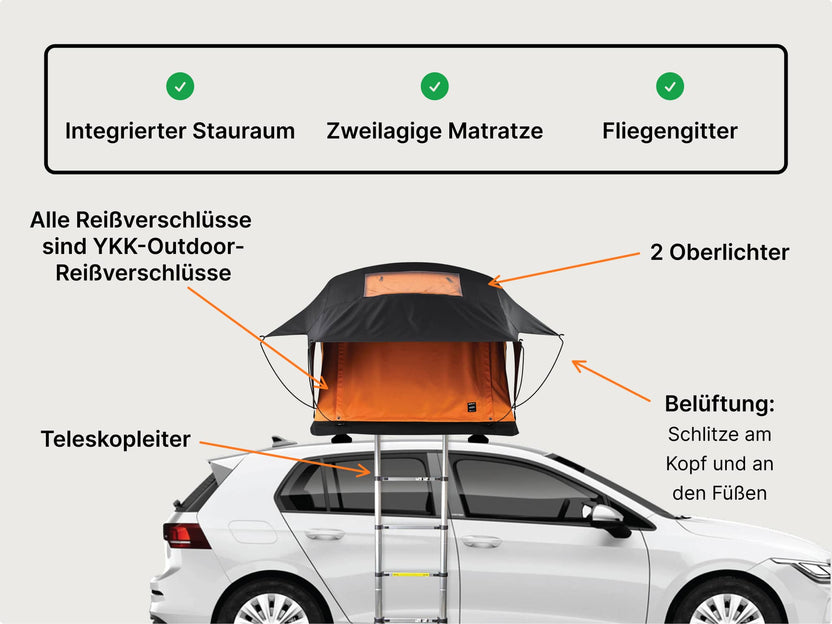 Trotz des Namens ist die TentBox eher eine gemütliche Schlafkapsel als ein klassisches Zelt – fast schon ein Mini-Wohnmobil. Du kannst überall schlafen, wo du dein Auto parken kannst, sogar auf festen Untergründen wie Parkplätzen oder Einfahrten. Du musst also nicht mehr nach einem ebenen Grasplatz suchen.