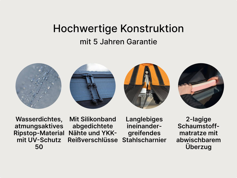 Alle unsere TentBox-Dachzelte sind so gebaut, dass sie auch starkem Wind und schlechtem Wetter problemlos standhalten. Selbst bei Sturm bleibst du trocken und sicher – dank des robusten Stoffes und der hochwertigen Konstruktion.