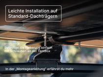Für das Aufheben der TentBox auf die Dachträger brauchst du die Unterstützung einer weiteren Person. Danach musst du nur noch die Befestigungsklammern einschieben und 8 Muttern festziehen.