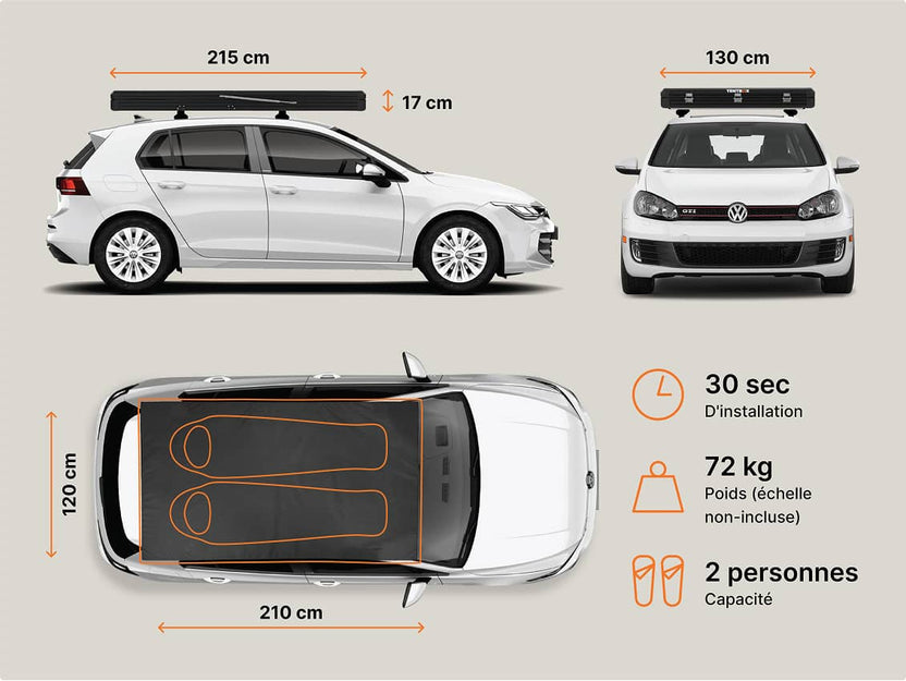 Est-ce compatible avec ma voiture ? Presque toutes les voitures sont compatibles avec au moins un modèle TentBox. Notre guide rapide est un bon moyen d'apprendre les bases, ou vous pouvez nous contacter pour obtenir des conseils.