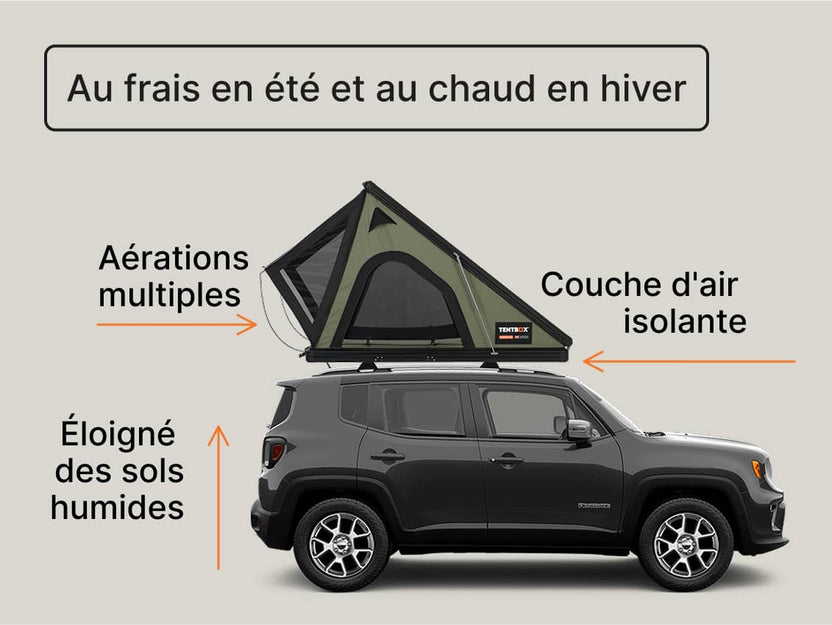 Non seulement être en hauteur vous offre une vue incroyable sur les paysages environnants, mais cela signifie aussi que vous êtes mieux protégé du froid, de l'humidité et des petites bestioles. La lame d'air entre la TentBox et le toit de votre voiture fournit une isolation naturelle, car la chaleur, au lieu de s'échapper dans le sol, reste dans votre tente.