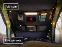 Gardez tout organisé avec poches latérales et de toit, plus un grand filet supérieur.