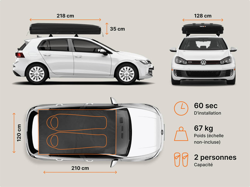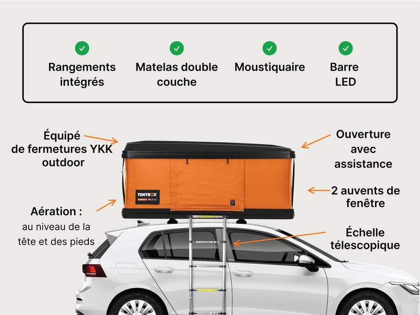 Est-ce compatible avec ma voiture ? Presque toutes les voitures sont compatibles avec au moins un modèle TentBox. Notre guide rapide est un bon moyen d'apprendre les bases, ou vous pouvez nous contacter pour obtenir des conseils.