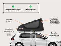 Livrée en kit, son installation initiale prend environ 60 minutes. Une fois fixée sur votre voiture, elle s’ouvre et se ferme en seulement 60 secondes – idéal pour camper à la dernière minute. Et si vous ne souhaitez pas la laisser sur votre toit toute l’année, vous pouvez facilement la retirer et la ranger dans son sac de rangement compact (vendu séparément).