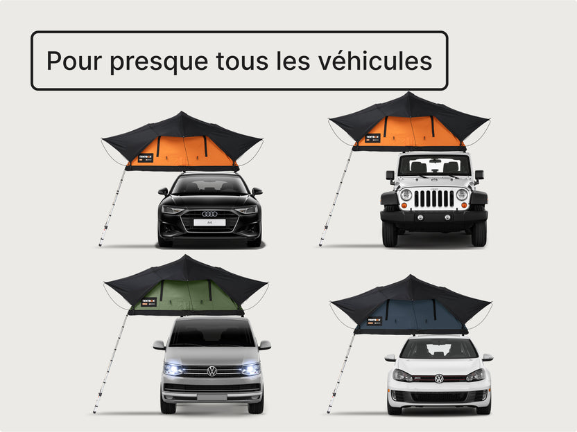Est-ce compatible avec ma voiture ? Presque toutes les voitures sont compatibles avec au moins un modèle TentBox. Notre guide rapide est un bon moyen d'apprendre les bases, ou vous pouvez nous contacter pour obtenir des conseils.