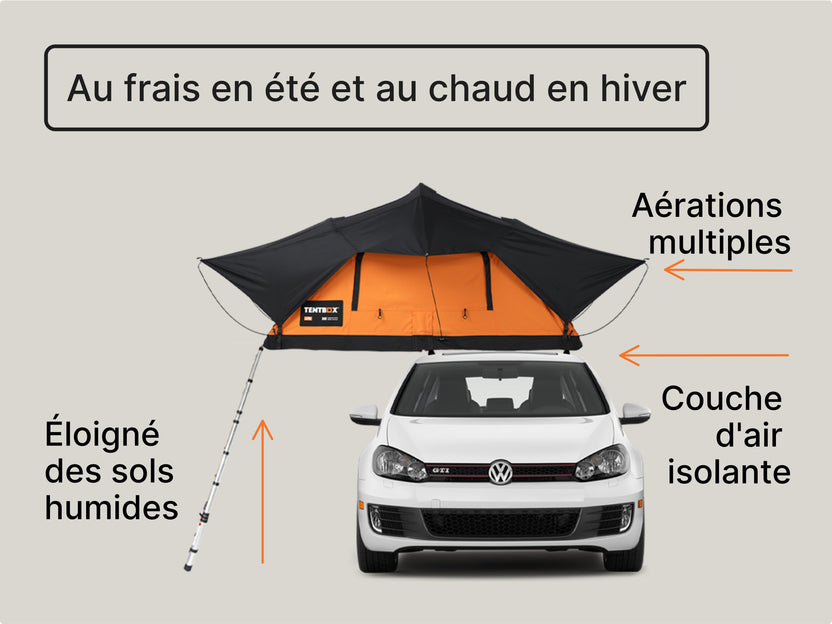 Non seulement être en hauteur vous offre une vue incroyable sur les paysages environnants, mais cela signifie aussi que vous êtes mieux protégé du froid, de l'humidité et des petites bestioles. La lame d'air entre la TentBox et le toit de votre voiture fournit une isolation naturelle, car la chaleur, au lieu de s'échapper dans le sol, reste dans votre tente.