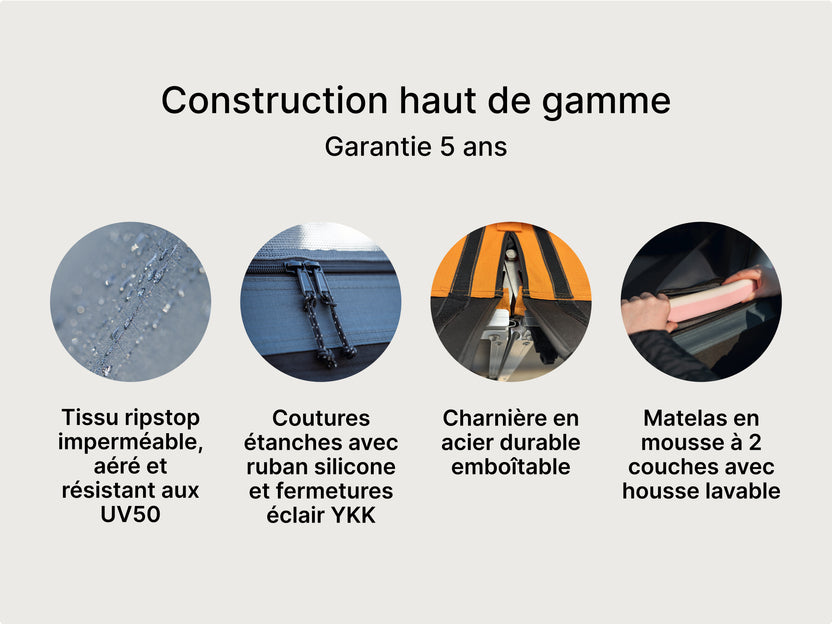 Nos tentes ont été fabriquées pour résister aux conditions les plus rudes, comme des tempêtes. Vous n'aurez donc aucun problème, même si vous décidez de braver les éléments ! Ces performances sont rendues possibles par nos matériaux de pointe et par une fabrication mettant l'accent sur la qualité.