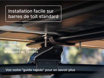 Pendant l'installation initiale, vous aurez simplement besoin d'une paire de bras supplémentaire pour vous aider à porter votre TentBox et à la déposer sur les barres de toit. Après cela, il y a juste à la faire coulisser dans les crochets de fixation et à serrer 8 écrous.