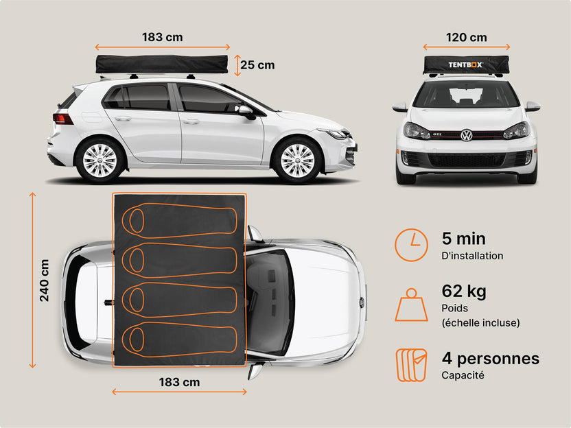 Est-ce compatible avec ma voiture ? Presque toutes les voitures sont compatibles avec au moins un modèle TentBox. Notre guide rapide est un bon moyen d'apprendre les bases, ou vous pouvez nous contacter pour obtenir des conseils.