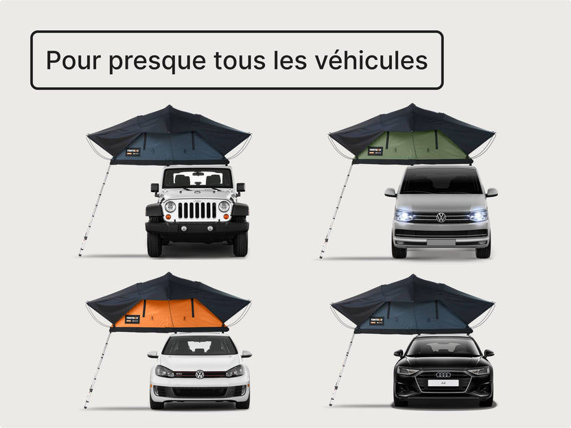 Il existe une tente de toit TentBox pour quasiment tout type de véhicule, à l'exception des décapotables et des Smart.